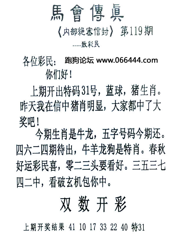 119期:{跑狗论坛}平特一尾<01-11-21-31-41>长期跟踪,稳赚不赔! |