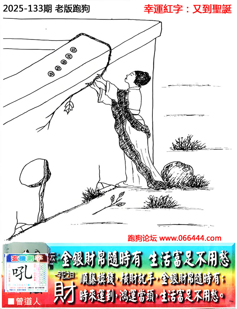 133期老版跑狗一字記之曰:【財】 詩雲:金銀財帛隨時有,生活富足不用愁。 順藤摸錢,橫財就手,金銀財帛隨時有; 時來運到,鴻運當頭,生活富足不用愁。 玄機測字:《吼》